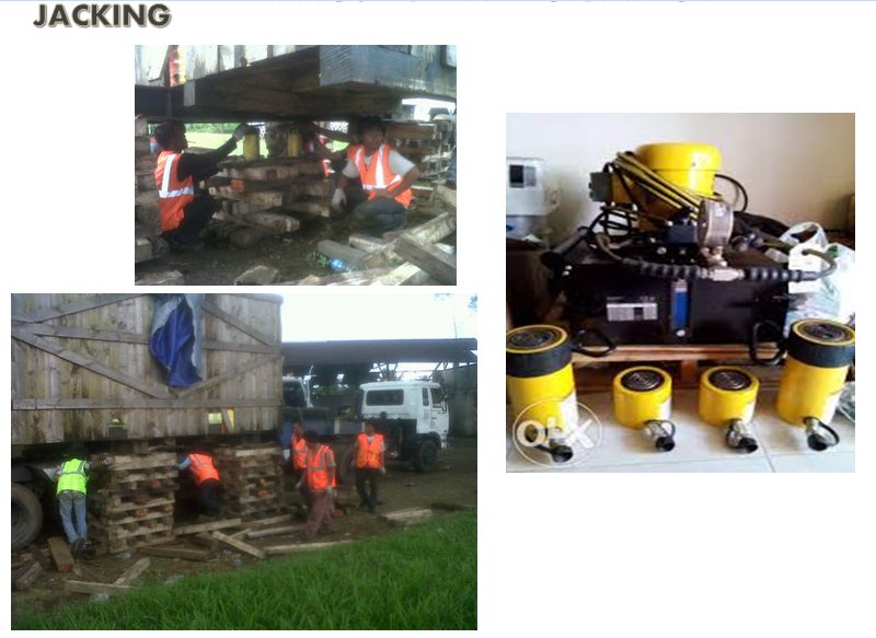 Jacking process is required to lift on foundation, sliding, or move a large and heavy cargo in a position that is difficult to reach with any lifting equipment such as mobile or crawler crane.